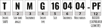 هر الماس تراشکاری دارای نامی مثل CNMG 432, TNMG 1604, CCMT 09T308 است که طبق استاندارد ایزو معنی دارد. این کد شامل موارد زیر است:
